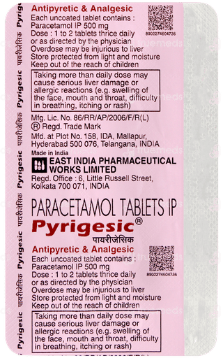 Pyrigesic 500 mg contains Paracetamol (500 mg). It is commonly used to reduce fever and provide relief from mild to moderate pain such as headache, body ache, and muscle pain.